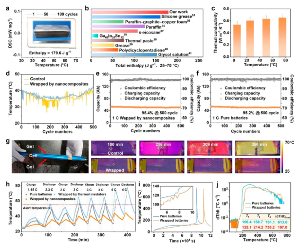圖 4. (a) 陶瓷-水凝膠納米復合材料的循環(huán) DSC。 插圖:由鋁塑薄膜封裝的納米復合材料。 (b) 比較報告的相變材料和冷卻劑之間的材料焓。 (c) 納米復合材料的熱導率。 (d) 長循環(huán)實驗中電池表面的溫度波動。 (e 和 f) 由納米復合材料包裹的四電池模塊在 1 C 下沒有保護的循環(huán)性能。(g) 測試的單電池照片及其在 100 至 350 分鐘放電過程中的 IR 圖像。 (h) 三個電池在充電和放電期間的溫度曲線。 (i 和 j) 純和納米復合材料包裹電池的 TR 溫度圖和通過 ARC 測試測量的相應溫度升高率。