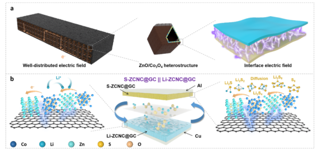 圖 1. 應用于鋰硫電池的雙功能復合電極示意圖。 (a) ZCNC@GC 主機的層次結構。 致密的 ZCNC 在均勻的多孔支架上生長,以建立具有充分利用界面電場的分層導電通路。 (b) S-ZCNC@GC的配置|| Li-ZCNC@GC全電池及界面電場加速電荷轉移的作用。作為鋰復合負極,ZCNC@GC 確保了鋰的均勻沉積并抑制了鋰枝晶。 作為 S 復合正極,ZCNC@GC 抑制多硫化物穿梭并加速 S 氧化還原動力學。