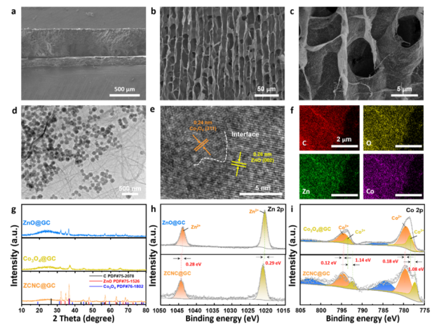 圖 2. ZCNC@GC 異質結構的形態(tài)和結構表征。 (a-c) SEM、(d) TEM、(e) HRTEM 和 (f) ZCNC@GC 異質結構的元素映射圖像。 (g) XRD 圖案,(h) Zn 2p 和 (i) Co 2p 的 ZnO@GC、Co