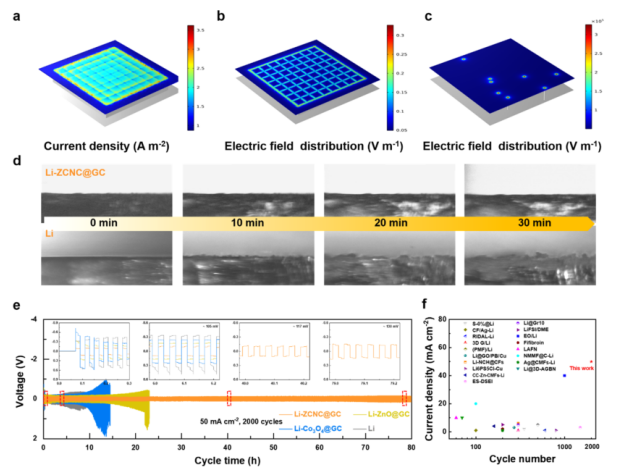圖4 ZCNC@GC異質結對枝晶生長的抑制作用的理論和實驗研究。 (a) ZCNC@GC異質結構支架中電流密度分布的模擬。 (b) ZCNC@GC異質結構電極和 (c) 裸鋰電極在鋰成核過程中的局部電場相對強度分布模型。 (d) Li-ZCNC@GC和裸鋰負極表面形貌的原位光學顯微鏡圖像。 (e) 使用不同陽極的對稱電池在 50 mA cm