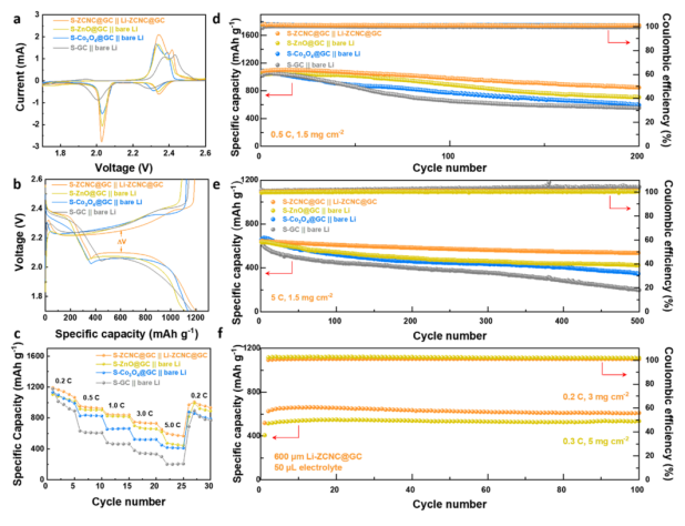 圖 5. Li-S 電池的電化學性能。 (a) 第一循環(huán) CV 曲線的比較。 (b) 0.5 C 時的恒電流充放電曲線。(c) S-ZCNC@GC 在不同電流密度下的倍率能力|| Li-ZCNC@GC, S-ZnO@GC ||Li, S−Co3O4@GC ||Li和S-GC ||Li電池。 (d, e) 不同電池分別在 0.5 和 2 C 下的長期循環(huán)壽命和相應的庫侖效率的比較。 (f) S-ZCNC@GC 的循環(huán)性能 || Li-ZCNC@GC 電池在 0.2 C 時硫負載量為 3 mg cm