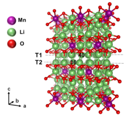 圖 2. LMO 的超級(jí)單體。 四面體鋰層標(biāo)記為 T1 和 T2。 顯示的超級(jí)電池沒有脫鋰。 在脫鋰的超級(jí)電池計(jì)算中去除了標(biāo)記為 36 和 40 的鋰原子。