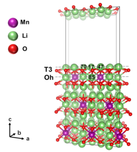圖 3. LMO (001) 表面的平板模型。 表面四面體鋰層標(biāo)記為 T3,次表面八面體鋰層標(biāo)記為 Oh。提取的鋰標(biāo)有識(shí)別號(hào)。