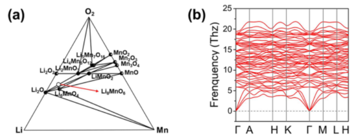 6的熱力學(xué)和動(dòng)態(tài)穩(wěn)定性。 (a) Li-Mn-O a t T = 0 K 的計(jì)算相圖。(b) 基電子態(tài) Li