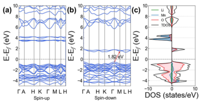 圖 6. PBE+U 的 LMO 電子結(jié)構(gòu)。 (a, b) 帶結(jié)構(gòu)。 (c) 總態(tài)密度 (TDOS) 和部分態(tài)密度 (PDOS)。 帶能量與費(fèi)米能級(jí)相關(guān),費(fèi)米能級(jí)設(shè)置為價(jià)帶最大值,如虛線所示。