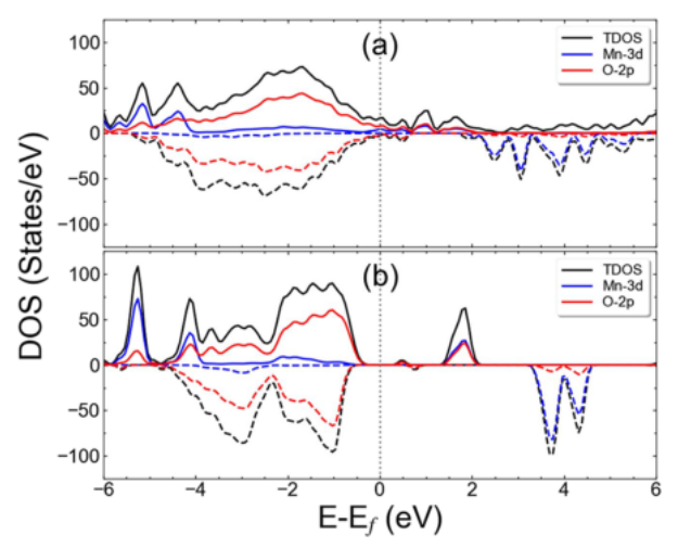 圖 11. Mn 和 O 原子的 PDOS 和 (a) 表面 Li94_x17, 85 和 (b) 超晶胞 Li94_x36, 40 的 TDOS。費(fèi)米??能級(jí)為 0 eV。