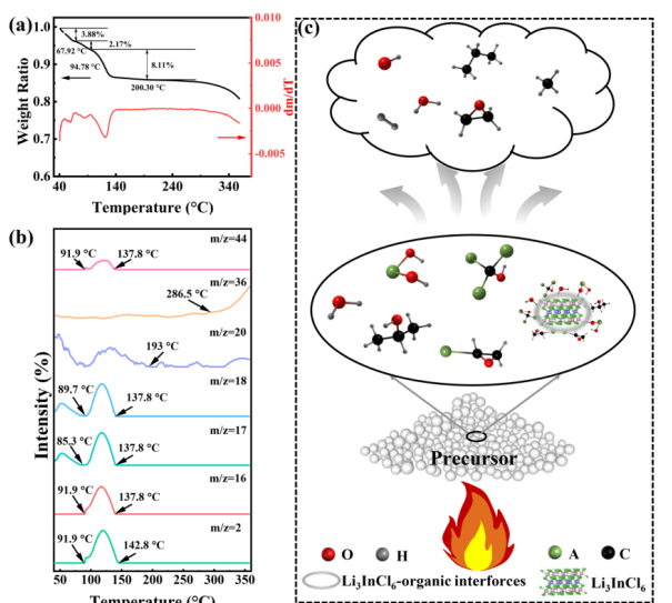 圖 2. TGA-MS 結(jié)果:(a) 在 Ar 下在 40 至 360 °C 下測(cè)試的乙醇介導(dǎo)前體的 TGA。 (b) 對(duì)應(yīng)的MS結(jié)果在40~360°C范圍內(nèi),TGA加熱過(guò)程中可能釋放出不同m/z值的氣體。 (c) 通過(guò)加熱乙醇介導(dǎo)的前體合成 Li