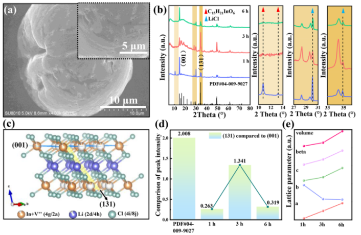 6 的典型晶體結(jié)構(gòu)(ICSD No. 04-009-9027)。(d)根據(jù)(b)中的 XRD 圖案,(131)面與(001)面的相對(duì)峰強(qiáng)度。(e) 通過(guò)乙醇介導(dǎo)的途徑制備的鹵化物電解質(zhì)的晶格參數(shù)變化趨勢(shì)。