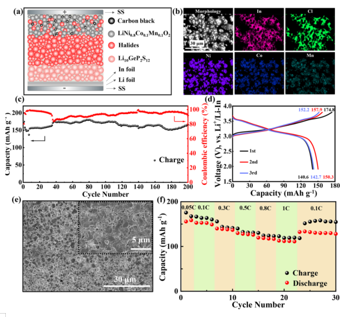 6-3在室溫下的電化學(xué)性能:(c) 0.1 C 下的循環(huán)性能(前兩個(gè)圓圈在 0.05 C 下激活電池)。(d) 200 個(gè)循環(huán)中前三個(gè)循環(huán)的恒電流充放電電壓曲線。(e) ASSLMB 中復(fù)合陰極顆粒在 200 次循環(huán)后的表面微觀形貌。(f) 在 0.05 C、0.1 C、0.3 C、0.5 C、0.8 C 和 1 C 時(shí)的倍率性能。