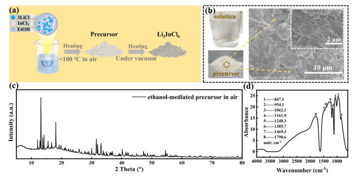 圖 1. (a) 本工作中乙醇介導(dǎo)的鹵化物電解質(zhì)合成路線示意圖。 (b) 透明溶液和獲得的前體的光學(xué)圖像,前體粉末的 SEM 微觀形貌。 (c) 乙醇介導(dǎo)的前體的 XRD 圖譜。 (d) 乙醇介導(dǎo)前體的 FTIR 光譜。