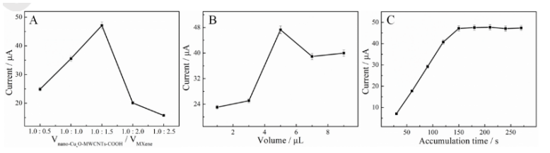 圖5 (A) nano-CuxOMWCNTs-COOH與MXene組成比例的影響。(B) nano-CuxOMWCNTs-COOH/MXene在GCE上的包覆量。(C) DPV對(duì)10.0 μM BN氧化峰電流的累積時(shí)間。