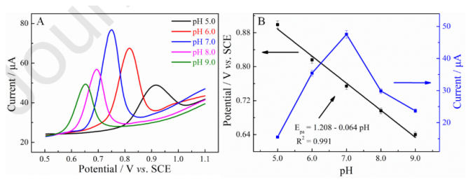 圖6. (A) nano-CuxOMWCNTs-COOH/MXene/GCE在不同pH值的PBS中測(cè)定10.0 μM BN的DPV曲線。(B) pH值對(duì)E