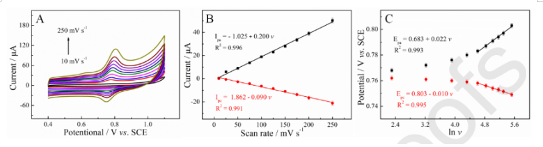 -1掃描速率下的CV曲線。(B)峰值電流與掃描速率呈線性關(guān)系。(C) E