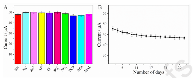 圖9 (A)各種干擾下對(duì)BN檢測(cè)的影響。(B) nano-CuxO-MWCNTs-COOH/MXene/GCE的穩(wěn)定性。