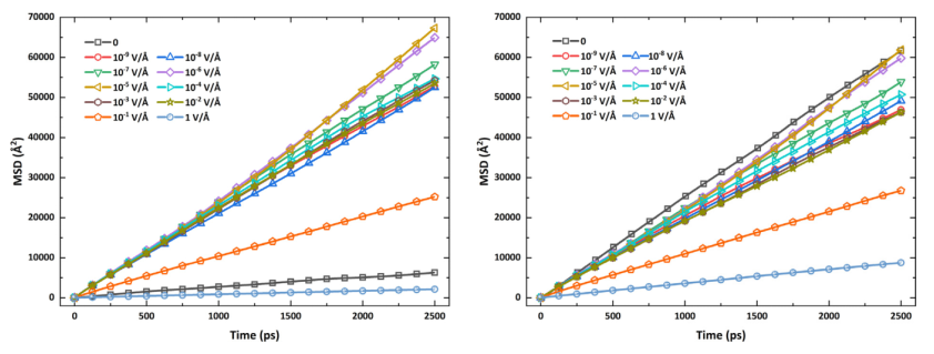 2(右)分子在不同電場下的均方位移(MSD)。