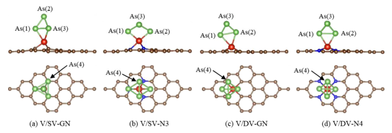 4在不同碳基單原子Ti/V/Cr/Mn吸附劑(氮原子摻雜、單空位和雙空位)表面的吸附特性。分析了單原子吸附劑的幾何形狀、吸附構(gòu)型、吸附能、電子結(jié)構(gòu)、電子密度等數(shù)據(jù)。通過(guò)對(duì)比分析16種吸附劑的計(jì)算結(jié)果,發(fā)現(xiàn)雙缺氮摻雜基底的催化劑具有較高的穩(wěn)定性。通過(guò)對(duì)電荷轉(zhuǎn)移和態(tài)密度的分析,發(fā)現(xiàn)單原子吸附劑催化劑對(duì)As