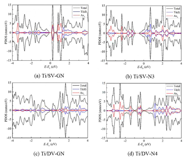 圖10. 四種不同Ti/GS吸附體系的PDOS吸附曲線。