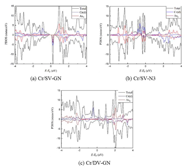 圖12. 三種不同的Cr/GS吸附系統(tǒng)的PDOS吸附曲線。