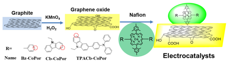 選取三種對稱鈷卟啉,其中位分別為芐基、三苯胺咔唑和咔唑,分別被命名為Bz-CoPor、Cb-CoPor和TPACb-CoPor,涂覆在氧化石墨烯(GO)上作為電催化劑,考察取代基對氧還原反應(yīng)(ORR)的影響。復(fù)合材料的光譜表征表明,卟啉與GO之間存在較強的電子耦合。通過一系列電化學(xué)測量研究了卟啉對ORR的取代效應(yīng),表明在酸性介質(zhì)中卟啉的結(jié)構(gòu)對還原電位、擴散限制電流密度、電子轉(zhuǎn)移數(shù)以及H