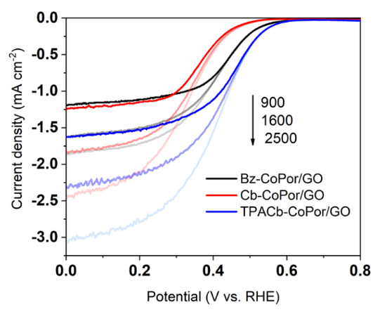 4中,不同轉(zhuǎn)速下Bz-CoPor/GO、Cb-CoPor/GO和TPACbCoPor/GO的RDE極化圖。掃描速率:10 mv s
