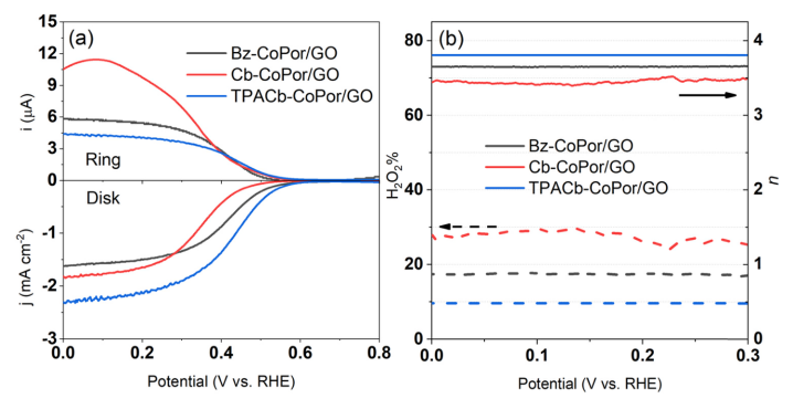 2生成率都有很大的影響。旋轉(zhuǎn)環(huán)盤電極(RRDE)測試表明,在三種卟啉/GO模型中,TPACb-CoPor/GO的電子轉(zhuǎn)移數(shù)最大,為3.8,H
