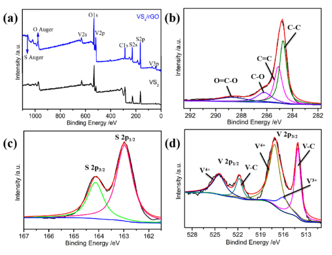 4的(b) C 1s、(c) S 2p和(d) V 2p核級及對應的退卷積光譜。