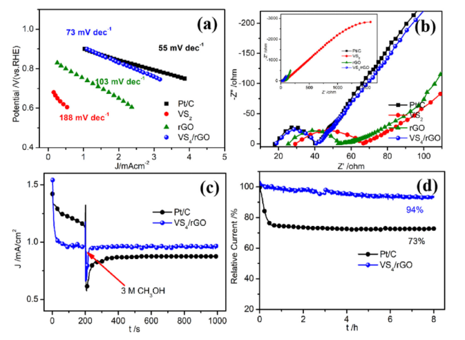 圖5. (a)三個樣品和Pt/C的Tafel圖。(b)三個樣品和Pt/C的EIS圖(插圖:與EIS一致的等效電路模型),(C) rGO改性VS