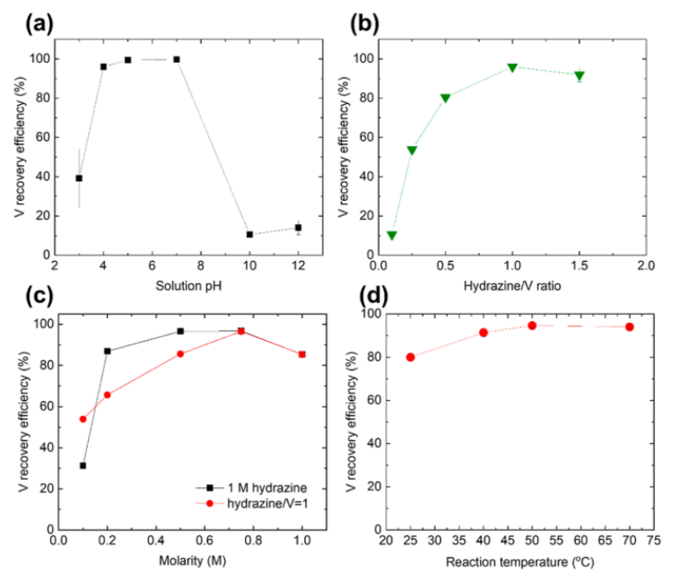 圖 3. pH (a)、肼/V 比 (b)、初始 V 濃度 (c) 和反應(yīng)溫度 (d) 對(duì) V 回收效率的影響。