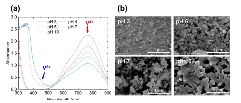 圖 4. 在不同 pH 值下回收的顆粒的紫外可見(jiàn)光譜 (a) 和 SEM 圖像 (b)。