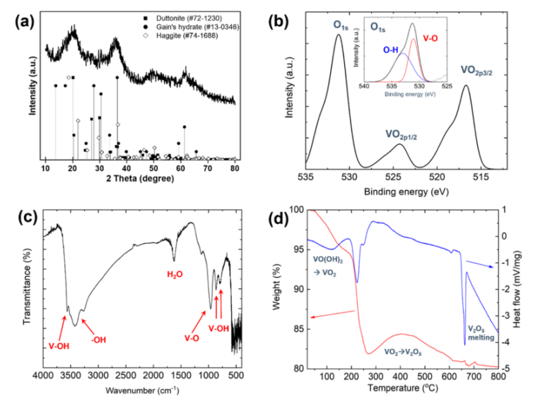 圖 5. 在 pH 4 下回收的 V 化合物的 XRD 光譜 (a)、XPS 光譜 (b)、FTIR 光譜 (c) 和 TGA-DTA 數(shù)據(jù) (d)。(b) 的插圖顯示了 O 1s 的解卷積 XPS 光譜 核心層面。