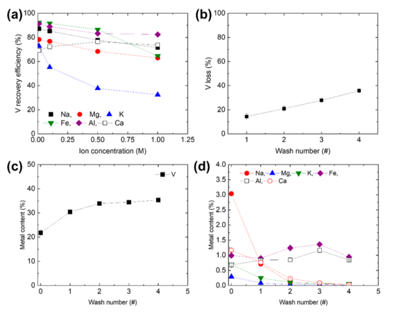 4/V = 1,pH 4,25 °C,12 小時(shí))(a),累積 V 損失 連續(xù)洗滌過(guò)程中的V沉淀物(b),根據(jù)洗滌次數(shù),V沉淀物中的V(c)和雜質(zhì)(d)含量。