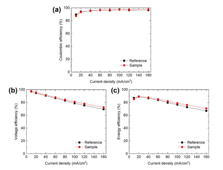 圖 6. 樣品和參比電解質(zhì)在不同電流密度下的 VRFB 電池性能:(a) CE、(b) VE 和 (c) EE。