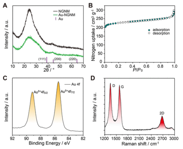 2吸收等溫線。(C) Au-NGNM 中 Au 4f 的 XPS 光譜。(D) 在 5 W 激光功率下獲得的 NGNM 拉曼光譜。
