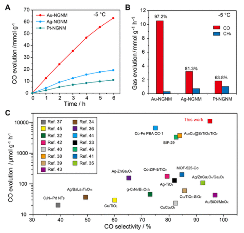 2產(chǎn)量和 (B) M-NGNM 在 -5 ℃的低溫下測(cè)量的選擇性。(C) Au-NGNM 超材料與其他由碳質(zhì)金屬和原子金屬制成的催化劑的性能比較。