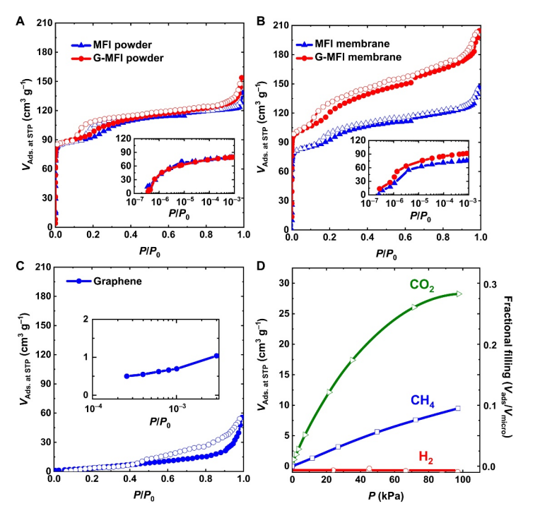 Figure 2. G-MFI 膜的孔隙率由77 K下的 N2吸附確定。( A ) G-MFI 和 MFI 粉末的 N2吸附 (Ads.) 等溫線。插圖是相應(yīng)的半對(duì)數(shù)圖。STP,標(biāo)準(zhǔn)溫度和壓力。( B ) G-MFI和MFI膜的N2吸附等溫線。插圖是相應(yīng)的半對(duì)數(shù)圖。( C )壓縮石墨烯的N2吸附等溫線。插圖是相應(yīng)的半對(duì)數(shù)圖。( D ) 吸附等溫線和 H2、CO2和 CH4的部分填充對(duì)壓力作圖。液體 H2的密度(0.0711 g cm