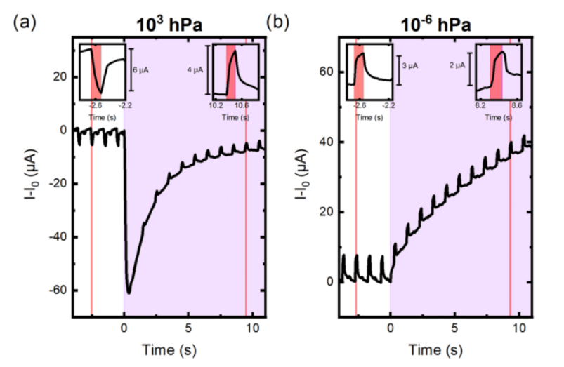 -1)。 在(a)環(huán)境和(b)真空條件下,描述了 I - I0 的實(shí)驗(yàn)結(jié)果與時(shí)間的關(guān)系。 時(shí)間 t = 0 s 標(biāo)志著紫外線(xiàn)照射的開(kāi)始。 在插圖中,顯示了數(shù)據(jù)集的放大部分。 在測(cè)量之前,樣品已儲(chǔ)存在 N