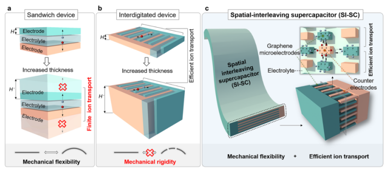 圖 1. 夾層、平面內(nèi)叉指型超級電容器與空間交錯 SI-SC 的架構(gòu)比較。 三明治和平面型超級電容器的示意圖。 (a) 電極的厚度從 H 增加到 H'。 增加三明治型超級電容器的質(zhì)量負(fù)載可能會延長電極中的離子傳輸路徑。 (b) 對于平面型超級電容器,加厚電極會導(dǎo)致犧牲其機(jī)械柔韌性。 (c) 顯示了 SI-SC 的示意圖和橫截面結(jié)構(gòu)。 SI-SC 中的每個微電極都與四個帶相反電荷的微電極相鄰,以實(shí)現(xiàn)高面積能量密度和機(jī)械靈活性。