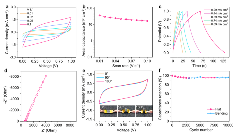 -2 的能量密度。 特別是每一層的微電極相互交叉,保證了SI-SC出色的機(jī)械柔韌性,在10