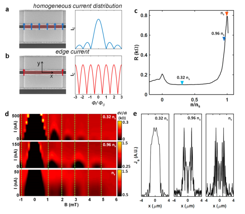 圖 2. (a) JJ 中均勻電流流動的圖示以及由此產(chǎn)生的弗勞恩霍夫干涉圖案。 (b) JJ 中的邊緣電流流動和由此產(chǎn)生的 SQUID 干涉圖案的圖示。 (c) 準四端電阻作為 6 K 時載流子濃度的函數(shù),使用 1 μA 交流激勵以避免器件 D1 的超電流。彩色三角形表示 d 中干涉圖案的載流子濃度。(d)低于和超晶格帶隙(300 mK)的載流子濃度的干涉圖案。 虛線表示在 0.32n