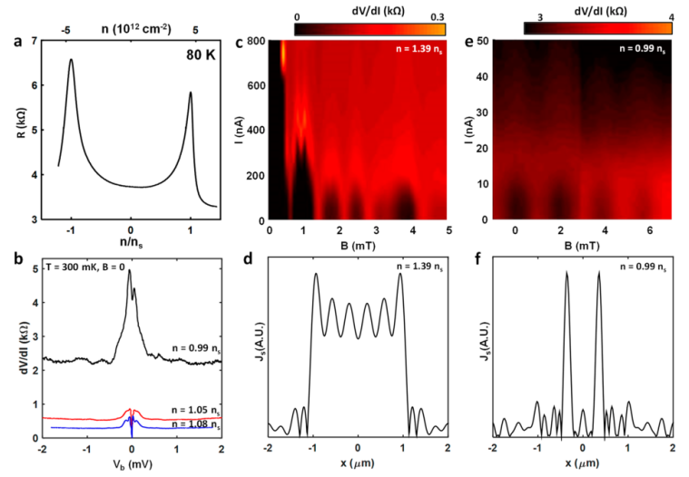 圖 3. (a) 器件 D2 在 80 K 時作為載流子濃度函數(shù)的兩端電阻。(b) 不同填充時 t-BLG JJ (D2) 上的差分電阻與測量的直流偏置。 (c) dV/dI 與 B 和 IDC 在 n = 1.39ns(遠離 SL 間隙)處顯示不完美的類似 Fraunhofer 的干涉圖案。 (d)在 n = 1.39ns 處重建 t-BLG JJ 中的電流分布,表明體積主導(dǎo)傳導(dǎo)。 (e) n = 0.99ns(SL 間隙底部)時的 SQUID 樣干涉圖案(dV/dI vs B 和 IDC)。 (f) 在 n = 0.99ns 處重建 t-BLG JJ 中的超電流分布,顯示兩個主要傳導(dǎo)通道。