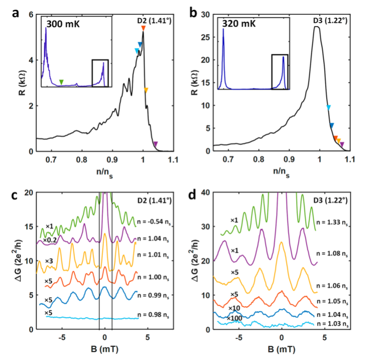 圖 4. (a) D2 的 SL 帶隙附近的 R 與 n,在 300 mK 處測量。 插圖顯示了從(-1.2ns 到 1.2ns)的全掃描。 彩色三角形表示 c 中數(shù)據(jù)的載流子濃度。 (b) D3 的 SL 帶隙附近的 R 與 n,在 320 mK 處測量。插圖顯示了從(-1.2ns 到 1.2ns)的全掃描。 彩色三角形表示 d 中數(shù)據(jù)的載流子濃度。(c) ΔG 對 B 表示接近和遠離 n = n