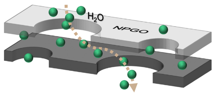 2重復(fù)單元、(b)納米多孔GO的正視圖、(c)氧化官能團(tuán)分布的側(cè)面圖、和(d)錯(cuò)位孔隙的2NPGO的分子構(gòu)型(黃色:H原子,紅色:-OH中的O原子,藍(lán)色:O = O中的O原子,灰色:C原子)。