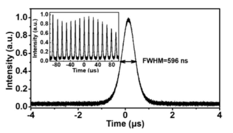 4晶體作為激光材料和一個(gè)藍(lán)色激光二極管(LD)單發(fā)射器作為泵浦源。在不采用任何非線性轉(zhuǎn)換過(guò)程的情況下,cw黃色激光器在573.9 nm波長(zhǎng)處獲得的最大輸出功率為351 mW,斜率效率為15%。為了產(chǎn)生調(diào)Q黃色激光器,單層石墨烯被用作可飽和吸收體。調(diào)Q黃色激光器的最大平均輸出功率確定為85 mW。得到的最短脈沖寬度約為596 ns,這相當(dāng)于重復(fù)頻率為78 kHz。計(jì)算得到的脈沖能量和峰值功率分別約為1.1 μJ和1.8 W。該方法在制造小型、經(jīng)濟(jì)的固態(tài)連續(xù)波和調(diào)Q黃色激光器方面顯示出巨大的潛力。