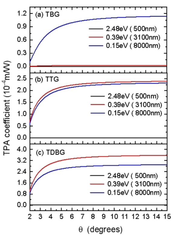 圖4. TPA系數(shù)與 (a) TBG、(b) TTG和(c) TDBG的三種不同入射波長的扭轉(zhuǎn)角的關(guān)系。
