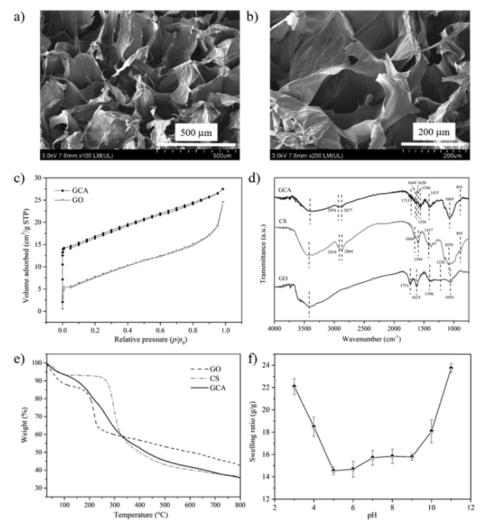 圖3. (a, b)GCA的SEM圖像, (c)GO和GCA的氮吸附-脫附等溫線, (d) FTIR光譜和(e)GO、CS和GCA的和TGA曲線, (f)GCA在一系列pH值時的溶脹性能。