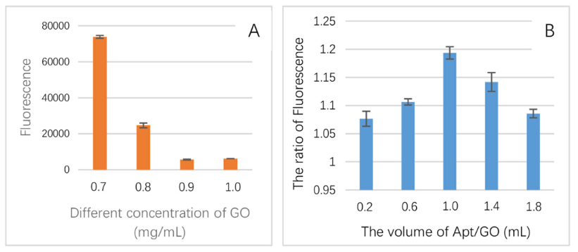 圖2. (A)不同氧化石墨烯含量下適配體/氧化石墨烯的熒光性;(B)不同體積淬火體系中陽(yáng)性基團(tuán)與陰性基團(tuán)的熒光比值。