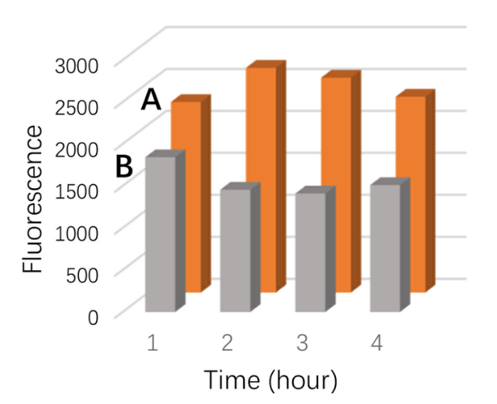 圖3. 不同體系的熒光回收率隨時(shí)間的變化(1h、2h、3h和4h)。 (A)該體系包含MIPs、GO和混合蛋白質(zhì),包括Lyz、OVA、HGB和BSA;(B)含有MIPs、GO和混合蛋白質(zhì)(包括OVA、HGB和BSA)的體系。