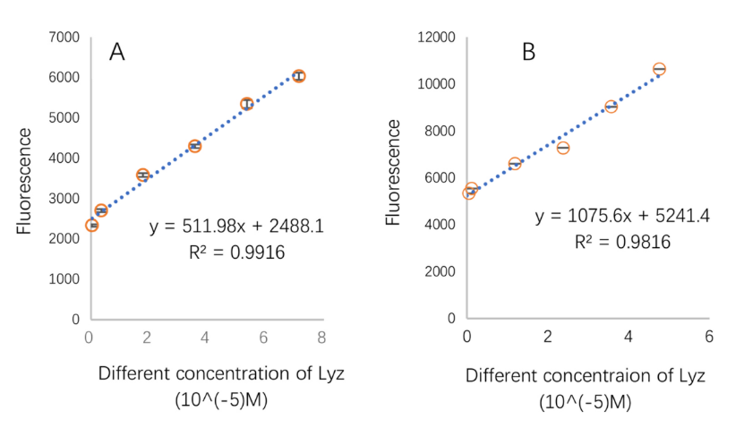 圖4. (A)緩沖液中Lyz濃度與熒光強(qiáng)度的線性關(guān)系;(B)血清中Lyz濃度與熒光強(qiáng)度的線性關(guān)系。