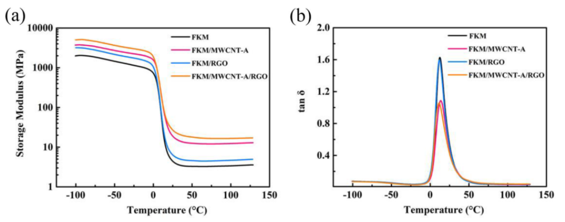 圖8. FKM、FKM/MWCNT-A、FKM/RGO和FKM/MWCNT-A/RGO復合材料的(a)儲能模量和(b) tand 。