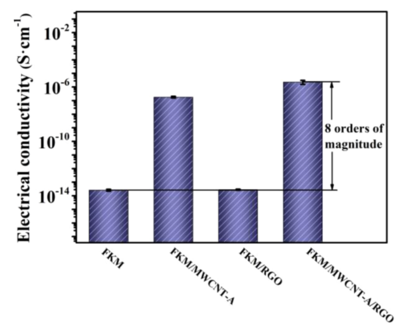圖9. FKM、FKM/MWCNT-A、FKM/RGO和FKM/MWCNT-A/RGO復合材料的電導率。